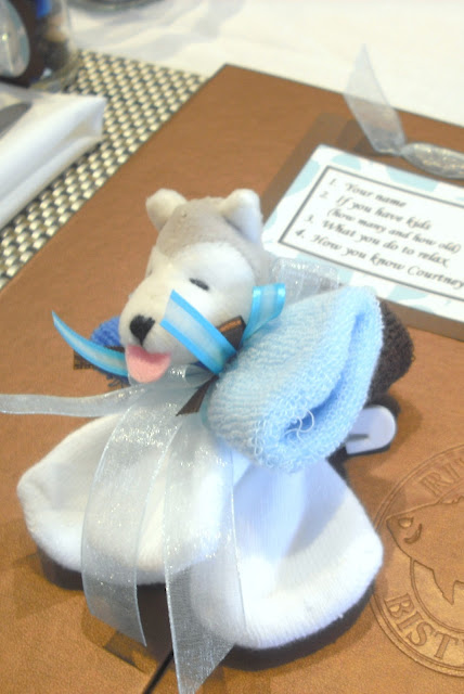 One of my crafty friends made the cute corsage for me. I gave her the socks and told her what I had in mind, and she put it all together! I figured our table at the bistro would actually be several tables pushed together, so to make the space look more unified I brought along a white tablecloth to lay down. At the shower we played two little games. I had put together a little card (using the same blue and brown card stock) at each place setting that asked each guest questions about themselves and how they knew the Mama of honor. We also played the "guess how many diaper pins are in the bottle". Back when we were pregnant with our first child and I had great aspirations of doing old school cloth diapers (not modern day "G" diapers - but cloth and plastic pants diapers) I had bought diaper pins by the handful. I didn't realize until after I had given birth that you really only needed one pack of four since you just use the same ones over and over again.