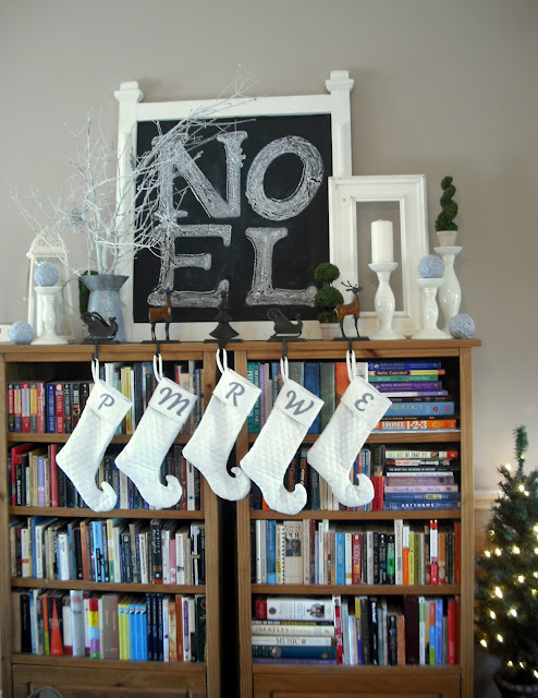 This year I had the urge to change out all of our Christmas decorations. Go neutral. No red. White spray paint became my new best friend! And with three kids and really only have one income coming into the house, I needed to create everything on a very tight budget. As I was walking through Home Goods, I came across an idea. White silhouettes. I took that one idea and ran with it. Grey was my complimentary color with green as my accent. I made slipcovers for our couch pillows, made matching stockings for each family member, changed out pictures in picture frames we already had hanging up, and shopped our house. I pulled out a lot of white items that I had used for parties.